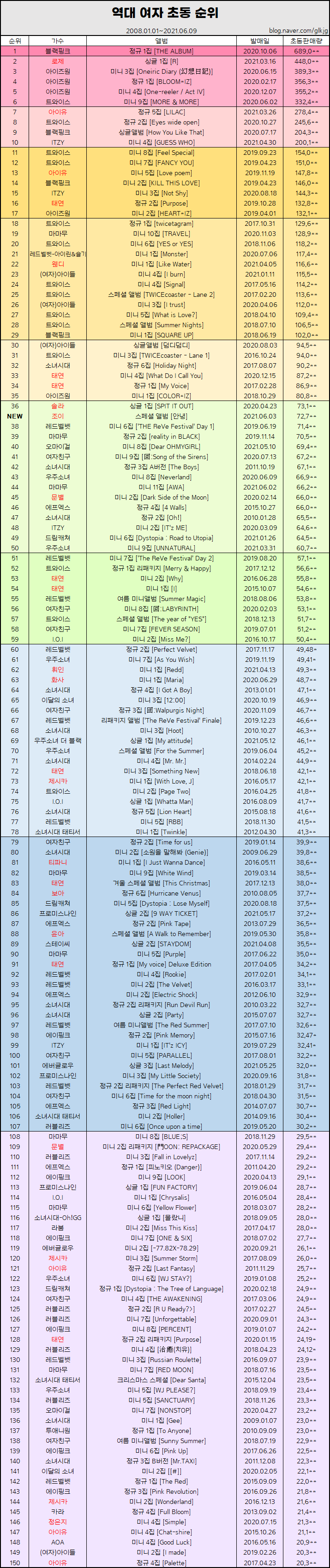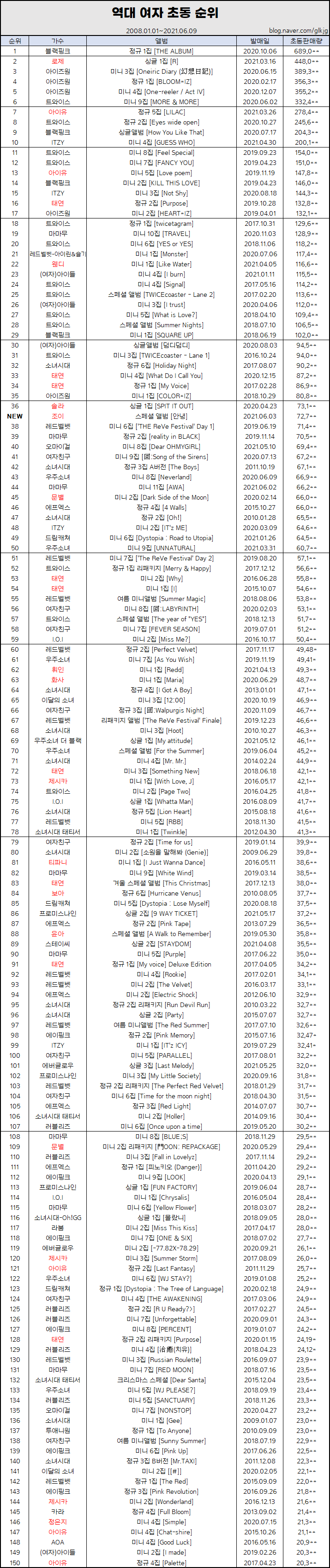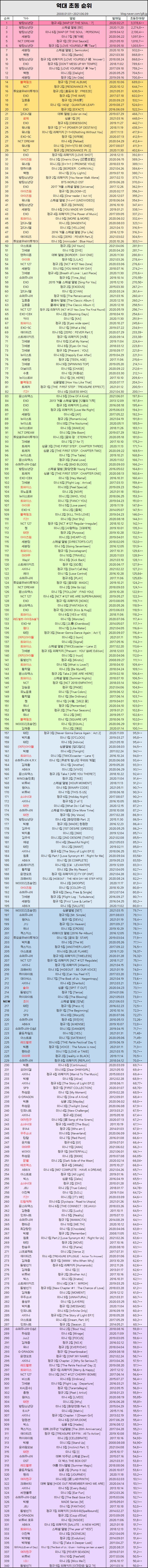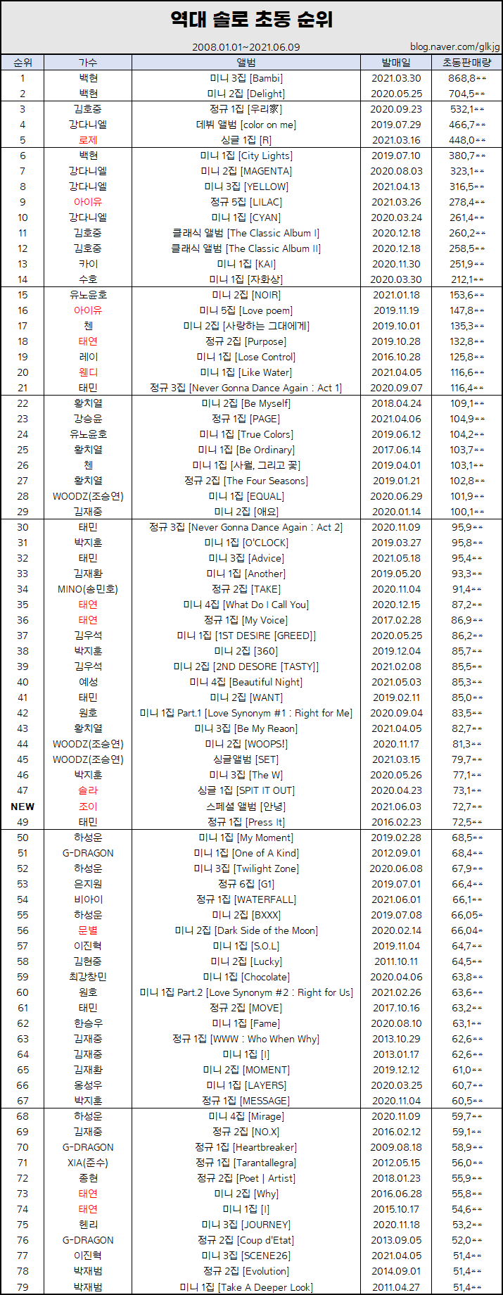 역대 초동 순위exo엑소 0 20210614. 여름 미니 1집 The Red Summer 242. 역대 여자 초동 순위조이 0 20210610.